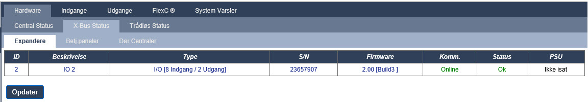 Følgende side med status for de forskellige X-Bus enheder vises. Alle fundne ekspandere er som standard angivet.