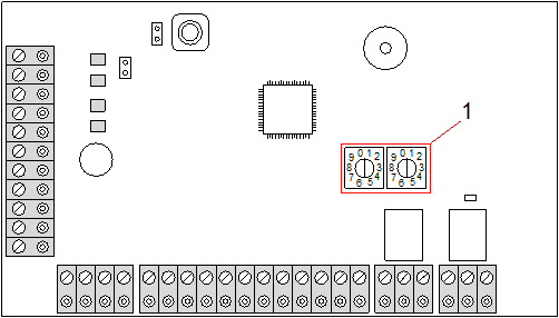 Les illustrations ci-dessous montrent l’emplacement des interrupteurs rotatifs, chaque interrupteur rotatif ayant une flèche pointant vers un chiffre l’identifiant (dans l’exemple : 3 et 8). L’interrupteur droit correspond au chiffre des unités et l’interrupteur gauche au chiffre des dizaines. Dans l’illustration ci-dessous, le transpondeur est identifié par le nombre 38.