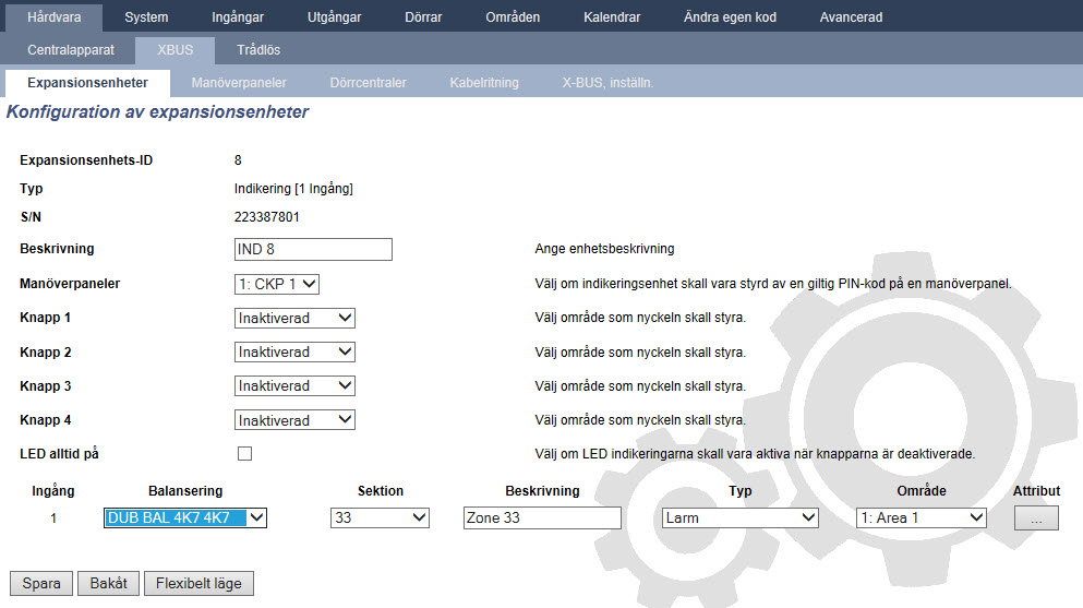 Exempel för SPC63xx: Expansionsenheter som är numrerade 1 t.o.m. 63 är allokerade till zoner (i grupper på 8) med identiteter i följd från 1 till 512 (största siffran i sektionsidentifiering är 512). Av den anledningen har expansionsenheter som betecknas eller identifieras med ett nummer större än 63 inga allokerade sektioner.
