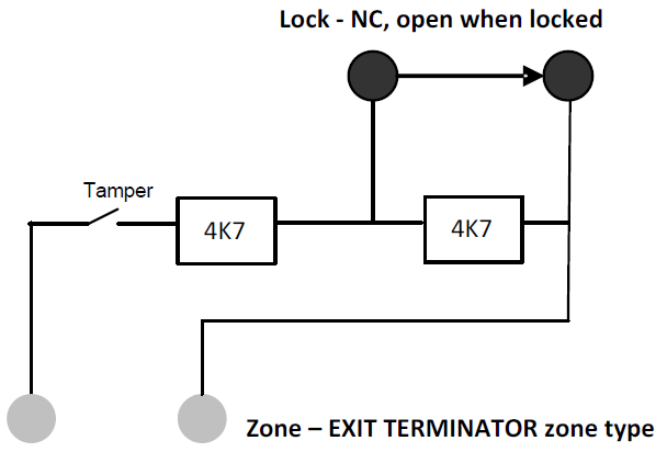 El contacto está montado en la puerta de salida final y conectado a una zona de Entrada/Salida con un atributo de ‘Fin de salida’.